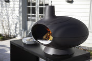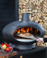 En solid og stilren ovn laget i svartmalt støpejern, med medfølgende keramisk pizzastein. Forno fungerer både som grill, utepeis, terrassevarmer og stemningsfull lyskilde. Den kan fyres med både ved og kull (husk kullrist). Merk at både ovn og underlag blir varme under bruk.
