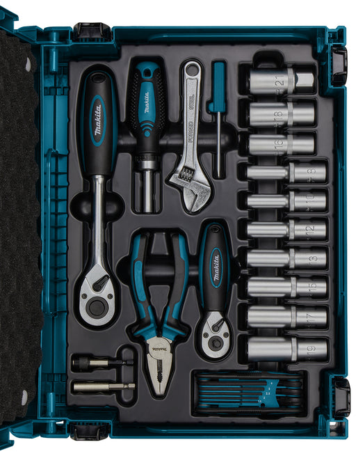 MakitaMakita Verktøysett med 87 deler - E-11542 Verktøysett med 87 deler i Makpac systainer Produktbeskrivelse: Inneholder 1/2" skrallehåndtak, 1/4"-3/8"...