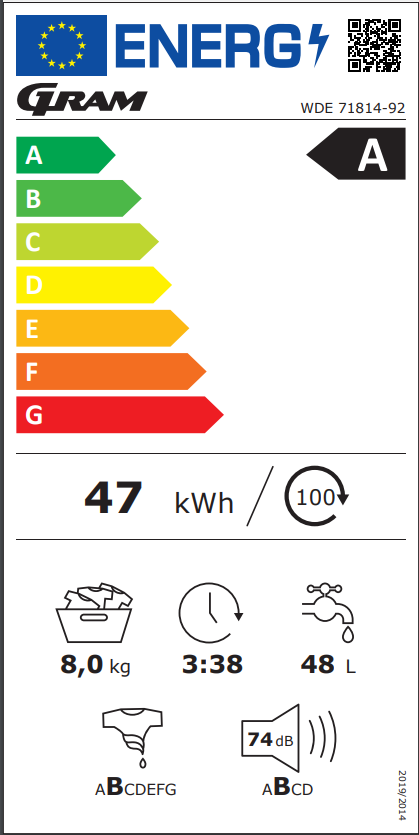 Se alle detaljerGram vaskemaskin i hvitt 84,5 cm WDE 71814-92