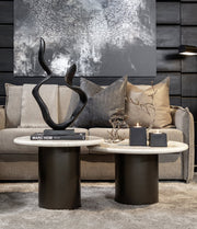 Bordplaten består av travertin med understell i mørkebrunt metall.