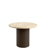 Bordplaten består av travertin med understell i mørkebrunt metall.