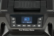 Robust og sprutsikker sort byggeplasshøyttaler som fungerer med 12V MAX, 18V eller medfølgende strømadapter.