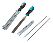 I settet følger det med 2 stk rundfiler, filholder til rundfil, 1 stk flatfil, 2 stk håndtak og kjedemåler.