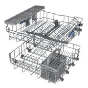 Den øvre kurven kan justeres i høyden slik at vinglass også kan ligge i kurven. Tallerkenradene kan legges ned i den nederste kurven hvis du trenger plass til store fat, boller og gryter. En bestikkurv følger med i den nedre kurven, som kan brukes med eller uten 'lokk'. Du kan derfor velge om bestikket ditt skal vaskes ekstra grundig, ved å plassere det enkeltvis i de forhåndsbestemte hullene i 'lokket', eller om du vil plassere bestikket ditt i de store rommene. Bestikkurven har 2 riller i bunnen, den er derfor veldig fleksibel å legge i den nedre kurven.