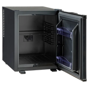 Kjøleskapet er utstyrt med peltierkjøling, som gir ekstremt lavt støynivå (kun 22 dB) og et elegant design i helsort finish med innvendig LED-belysning.