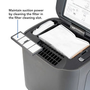 Tømmestasjonen har egen funksjon for å automatisk rense robotens støvfilter effektivt og enkelt. Et rent filter er viktig for å opprettholde robotens sterke sugeevne og for å spare og bevare robotens batteri og motor. Det medfølger et ekstra filter på egen plass under lokket på tømmestasjonen, der også rensingen utføres. Rensingen skjer ved hjelp av at tømmestasjonens høye sugekraft blåser filteret rent.